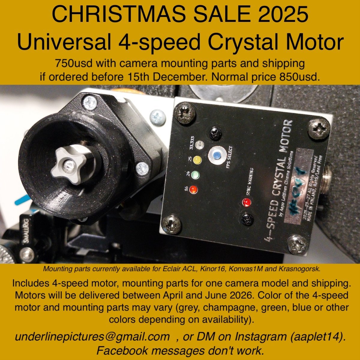 I still have possibility to make Bolex crystal motors in 2026 if there is possibility to get enough paid preorders so that I can buy a reference bolex with 1:1 axle as I only have 8:1 older versions. And get enough budget for cnc machining tests, these have more complex mechanics than most of my motors so the tests cost a lot. The plan is to make one crystal motor version with two slightly different mounting systems so that there is versions for both 1:1 and 8:1 bolexes available. Not promising the motor part would be exactly the same, it is possible that I would need to make two entirely different motors but the features would be approx the same on both. Works at 14.8v batteries so mini-vlock batteries etc work fine with these. At least 4 crystal speeds but can be more, will know in Summer about speeds if the project is possible to start now in Spring. These projects always have the financial risk of not getting enough paid orders and I would then need to make the motors with huge losses and the schedule would overshoot a lot. Additionally it is sometimes challenging to estimate the exact price of the motor with these lower cost ones because it is so uncertain how much demand there is and the batch size affects directly the parts costs. So in the case of this particular project there would be a deposit which needs to be paid when placing the order. IF the project would not get made then the deposit would be returned (in full if wire transfer or paypal friends&family, otherwise the paypal costs taken off first and the rest returned). IF the project gets made but you decide to not pay the rest for not needing the motor after all, then the deposit won't be returned but you could use it as partial payment for other products I am offering like the 4-speed motor or Aaton Counter etc. When there is enough orders so that it is certain the project would be made, then the rest of the price is paid. This would be between February and April 2026. I need to start the project in March 2026 so there is couple of months to collect orders now. I can only make one batch of motors in Autumn2026 so this won't be available later. The plan is to make as many Bolex motors as possible in 2026 so that there will be as many crystal sync cameras as possible available for aspiring filmmakers when I stop making motors in 2027. I estimated the Bolex motor would cost between 900 and 1050 usd with shipping. The exact price is known when I have all the orders in and can calculate the exact parts costs. Both the 1:1 version and 8:1 version is available so these should fit all Bolexes. The 1:1 mounts to the mounting points on the camera side and the 8:1 has a mounting bracket which is attached to the bottom of the camera and possibly to one corner too to keep the motor in place. Deposit 250usd when placing the order. The remaining amount and exact final price is calculated when there is enough orders in to start the project. Available for order now. Let me know asap, you can DM here or on Instagram(aaplet14).